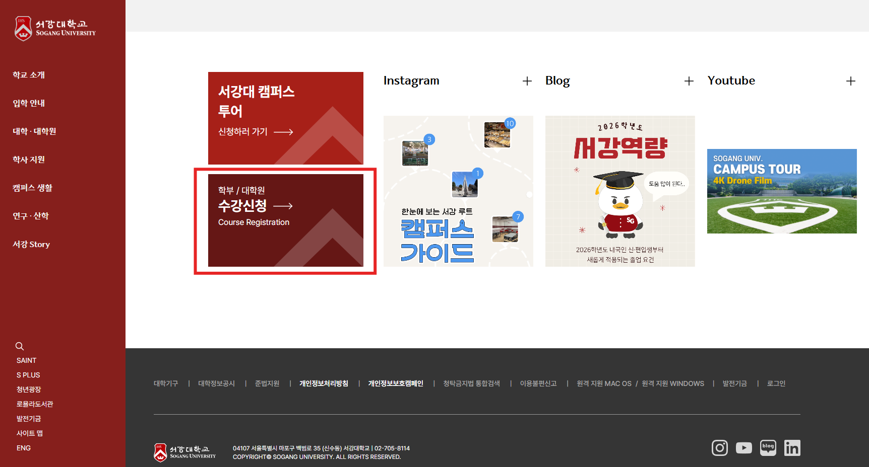 서강대 메인 홈페이지 좌측 하단 <수강신청> 클릭 후 로그인